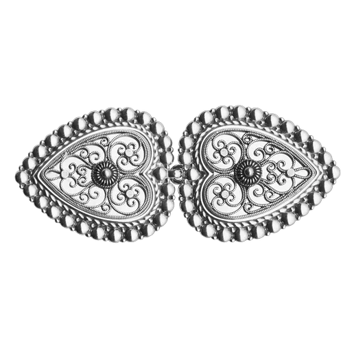 Blanke, hjarteforma beltespenner i oksidert sølv. Den er omkransa med nydeleg perlekant og filigrandekor med kruse i midten. Vert montert på skinnlist.