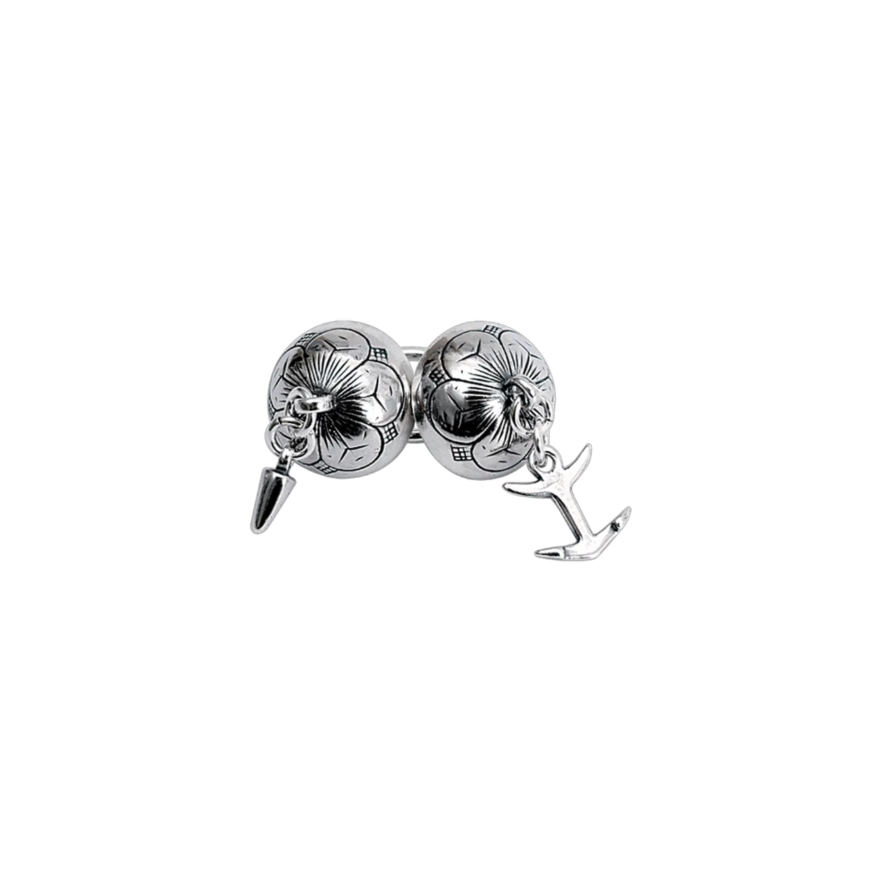 Dobbel halsknapp i oksidert sølv til Østfold herrebunad. Den karakteristiske halsknappen med spyd og anker har opphav frå gamle funn på Onsøy. Vert tredd gjennom knapphola øvst på skjortekragen.