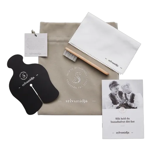 For at bunadsølvet ditt skal blenkja den dagen du skal bruka det, må du gje det litt ekstra kjærleik. Dette sølvpussesettet består av ein pusseklut, ein mjuk kost og eit praktisk pussebrett som beskyttar bunadsstoffet medan du til pussar knappane. Du får også eit lite hefte med pusseoppskrift og anna informasjon du treng å vita for å halda bunadsølvet ditt fint.