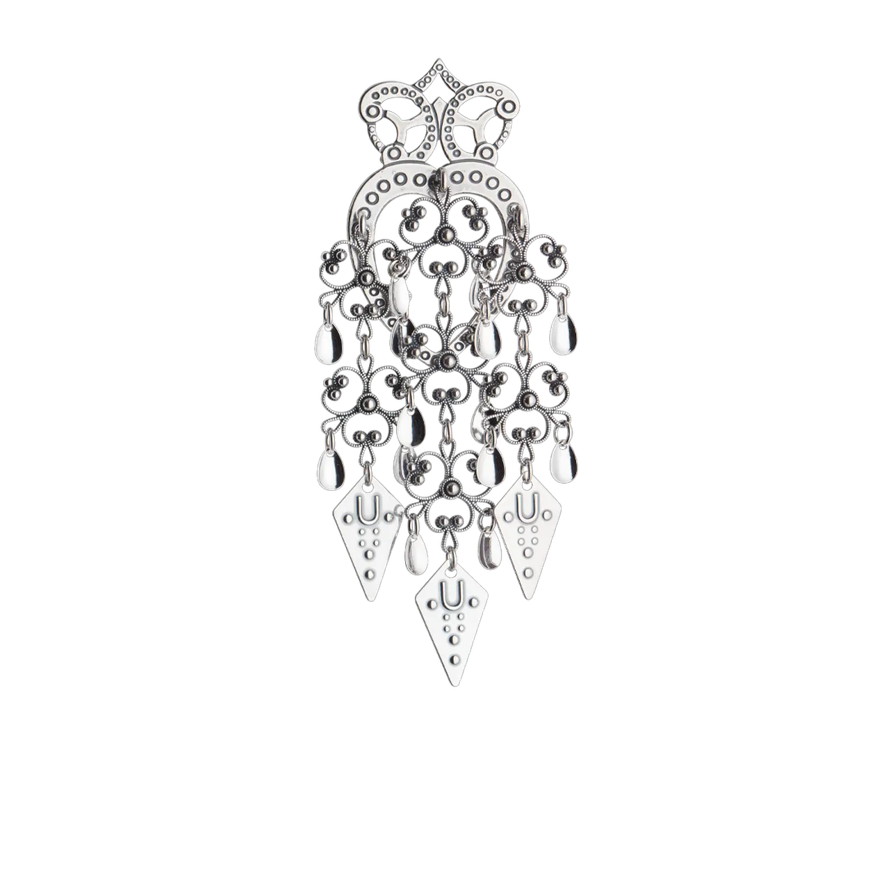 Hjertesølje til Østfoldbunad. Den er i oksidert sølv med heng og spirlauv. Hjarteforma med kruna på toppen har langt tilbake hatt ein symbolsk tyding av kjærleik. Denne sølja finst også med kortare heng.