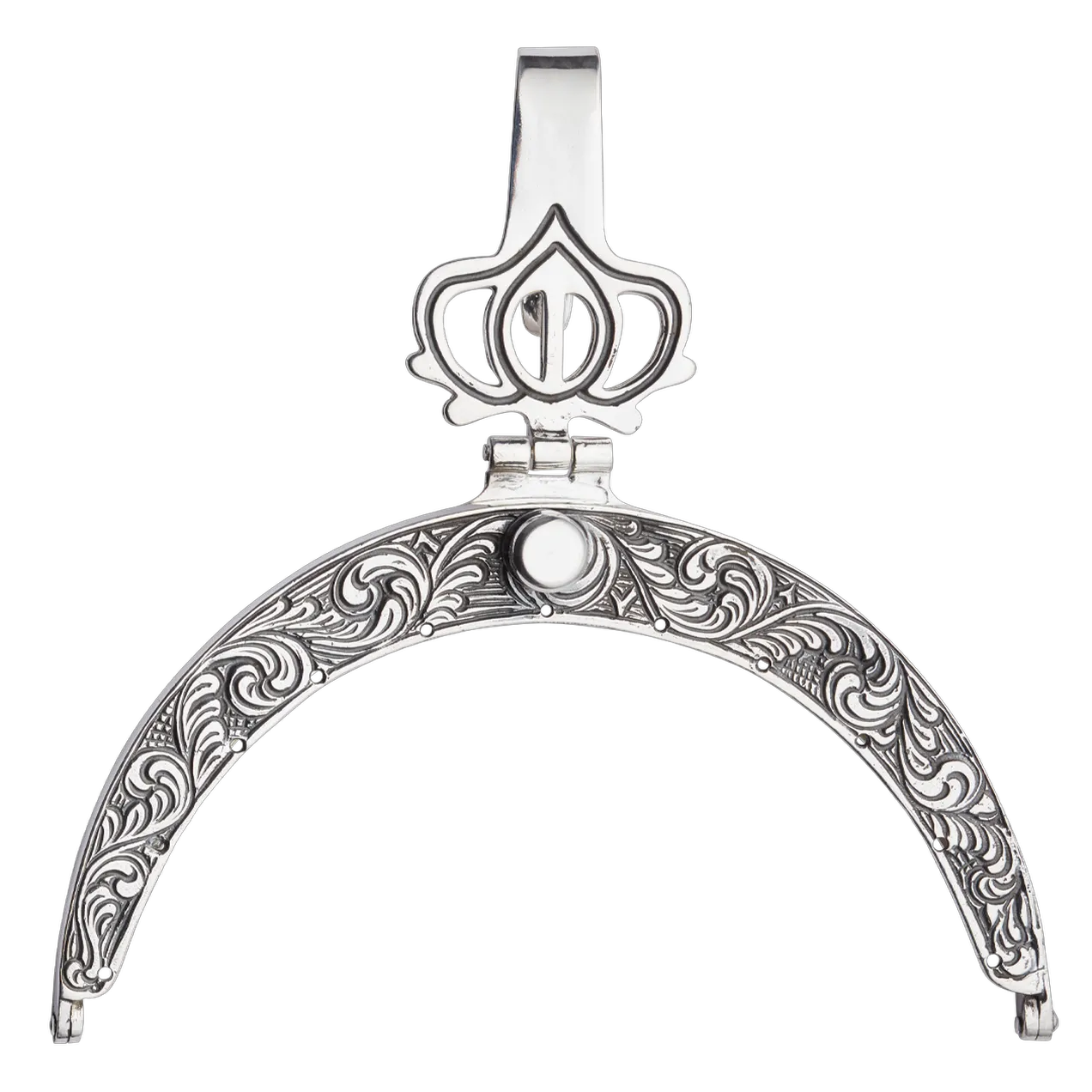 Veskelås i oksidert sølvplett til Østfoldbunad. Den er inspirert av gamle funn i Rakkestad.